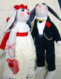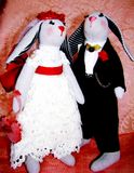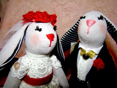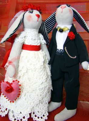 Текстильные свадебные зайцы-тильды. Незабываемый и необычный подарок на торжество бракосочетания или на юбилей. Эксклюзивный подарок, который будет радовать супружескую пару долгие годы. Самостоятельно стоят. Крепление ручек - пуговичное. Мордочки вышиты нитками мулине, глазки - чешский бисер.Платье из винтажного кружева,в лапках сумочка из фатина ,обшитая бисером. Высота 26-28 см.