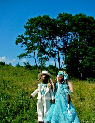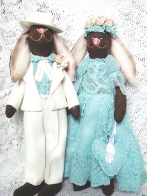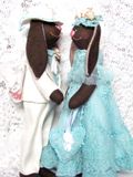 Шоколадные текстильные свадебные зайцы-Тильды. Незабываемый и необычный подарок на торжество бракосочетания или на юбилей. Эксклюзивный подарок, который будет радовать супружескую пару долгие годы. Самостоятельно стоят. Крепление ручек - пуговичное. Мордочки вышиты нитками мулине, глазки - чешский бисер. В лапках сумочка из фатина ,обшитая бисером. Высота 26-28 см.