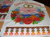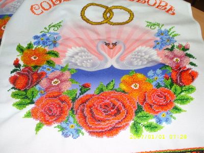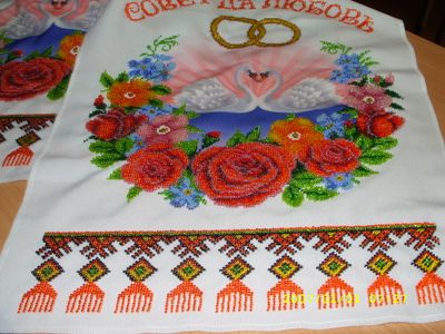 Свадебный рушник вышитый чешским бисером. Ткань- габардин. Размер готовой работы 40 см* 250 см. С давних времен рушники в народных обычаях выступали как обереги. Это магическое значение рушнику придавала вышивка, через орнамент, цвет, месторасположение отдельных элементов. Во время венчальной церемонии(или во время процесса бракосочетания в ЗАГСе) свидетели расстилают "венчальный" рушник, на который становятся молодые. Рушник под ноги- самый главный на свадьбе. Становясь на рушник, молодые получают Благословение свыше. Также на рушнике выносят свадебный каравай при встрече молодых. Свадебный рушник- первая семейная реликвия, он передается из поколение в поколение. Вспомните старинные свадебные обряды, воплотите их в жизнь на собственном празднике и тогда воспоминания о Вашей свадебной церемонии сохранятся на долгие годы. Возврат и обмен не предусмотрен. При желании предоставляются дополнительные фотографии.