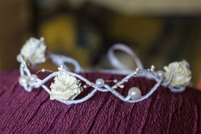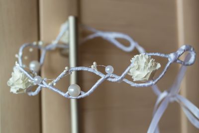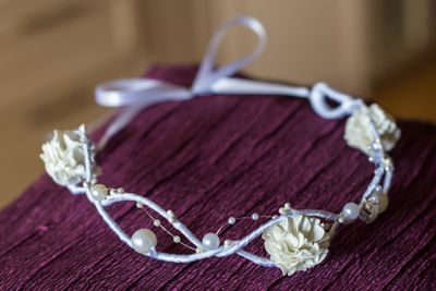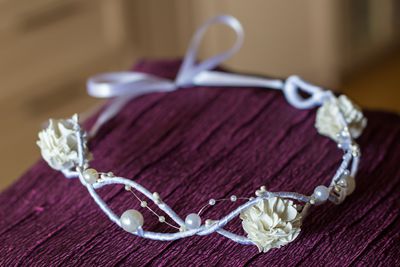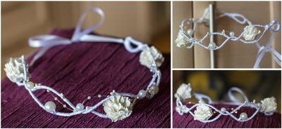Венок на проволоке, оплетен атласной лентой, цветы - фоамиран, бусины. Свадебный. Размер регулируется.