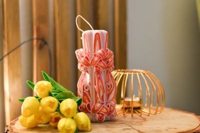 Резная свеча сделана вручную и может являться прекрасным подарком родным и близким, коллегам и друзьям. Так же это идеальное интерьерное украшение. Не обязательно иметь дома камин, свет резной свечи принесёт уют и создаст неповторимую атмосферу. При горении свечи не выделяют вредных веществ. Вокруг фитиля имеется углубление, благодаря которому, свеча не течет, а пламя опускается внутрь, создавая удивительный эффект. Резная свеча сделана из: - пищевого парафина П2 высокой степени очистки; - свечного красителя; - хлопкового фитиля; - свечной лак (специальный не токсичный лак не дает Резной Свече оплавляться во время горения и придает красивый глянцевый блеск). Высота свечи 20см.
