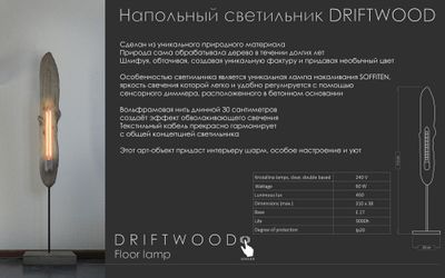 Ссылка на видео - https://youtu.be/RTFvFipNO_Y Дрифтвуд - уникальный природный материал, дрейфующее дерево, которому в течение многих лет морская вода, солнце, ветер, песок и камни придают его неповторимые цвет и форму, которых не добиться при помощи каких-либо инструментов и современных технологий. Не просто светильник, а настоящий арт-объект для авангардистских,урбанистических и лофт интерьеров. Уникальные лампы накаливания производства Швейцарии с нитями из вольфрама создают неповторимую, тёплую и уютную атмосферу. Источники света не спрятаны за абажурами и плафонами, они выставлены напоказ, притягивая восхищённые взгляды. Мягкий свет наполняет пространство сиянием, придающим невероятное очарование и магнетизм. Плавная регулировка злектронным диммером позволяет устанавливать любую яркость свечения нити и гарантирует долгую работу светильника. Даже при максимальной яркости создаётся эффект обволакивающего свечения. В мире современного дизайна брутальная фактура бетона выглядит смело, стильно и современно. Грубое бетонное основание в сочетании с изяществом выветренной древесины и ламповым светом объединились в концептуальном художественном объекте. Неповторимый и трендовый облик светильника DRIFTWOOD в характерном стилистическом исполнении преобразит современный интерьер. Отправка в регионы транспортной компанией СДЭК.