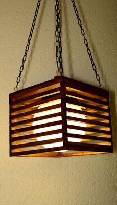 Светильник из натурального дерева, ручная работа, цвет дуба,на одну лампочку, размер 20*20*17,5см, вес 1.3кг, крепится на 4 декоративные цепи,расстояние от потолка 75см,цоколь лампочки Е27.
