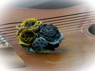 Брошь выполнена из натурального крепдешина,джинсы. Украшена тесьмой,бусинами,бисером.На задней стороне имеется надежное крепление-застежка.