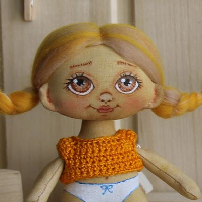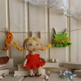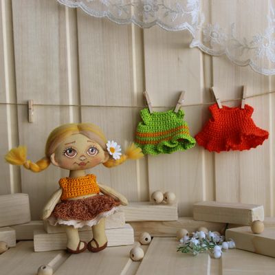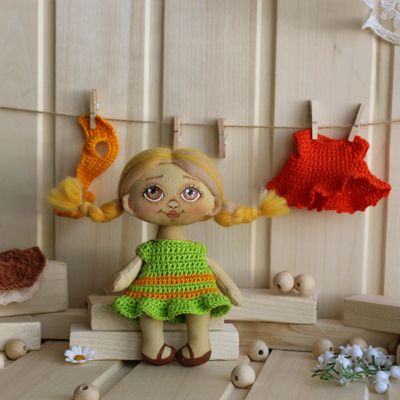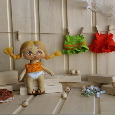 Здравствуйте, здравствуйте! Мне часто задают вопрос, может я не наигралась в куклы в детстве? Наигралась я, правда куклы у меня были бумажные. Не сшила мне мама вот такую куколку, чтобы я могла наряжать её, шить ей одежки. Я представила себя маленькой девочкой и сшила вот такую куколку с озорными косичками и карими глазками, величиной 15 см. Зато вся одежда съемная. У куколки два платьица, кружевная юбочка и топик. А связала я комплект одежды кручком для того, чтобы одежка не расползлась по швам в процессе игры с куколкой. В дальнейшем, ваша девочка, сможет сама шить наряды для своей малышки. Личико куколки расписано акриловыми красками, тонировка сухой пастелью. Прическа из шерсти для валяния, косички расплетать не стоит. Куколку можно подарить по любому поводу или просто порадовать свою любимую девочку.