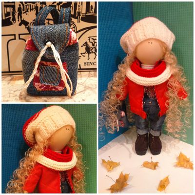 Очень симпатичная кудряшка.Стоит самостоятельно, курточка снимается.Рост 35см.Отличный подарок на любой праздник.