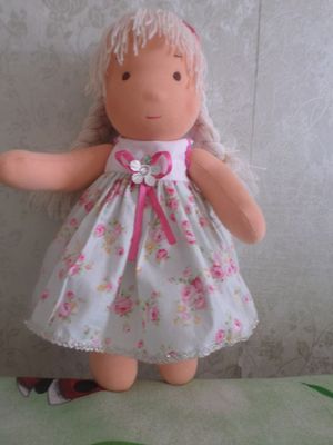 Куколка полностью текстильная, без твердых и сыпучих наполнителей, сшита из натурального хлопкового трикотажа, набивка - искусственное волокно, волосы из тонкой шерстяной пряжи, вшиты по всей головке равномерно, их можно аккуратно расчесывать и менять прически. Кукла сидит сама, без опоры, стоит только с подставкой. Ручки и ножки двигаются легко во все стороны, вся одежда снимается (платье нижнее, сарафан, панталоны).