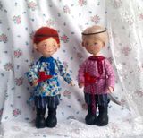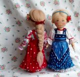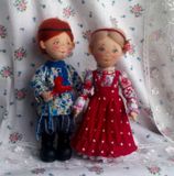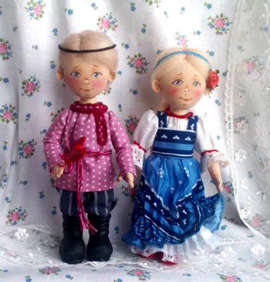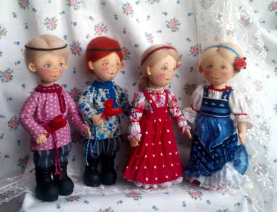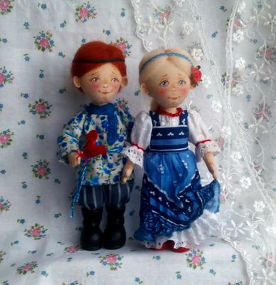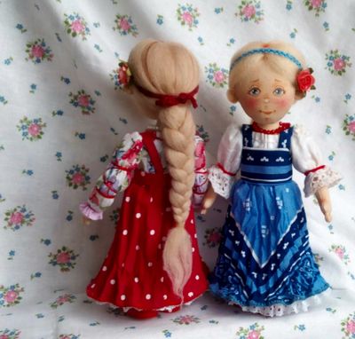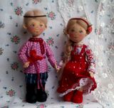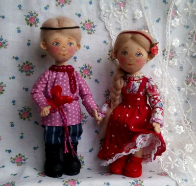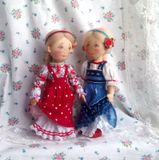 Текстильные куколки - малышки в нарядах по мотивам русского народного костюма пополнят вашу коллекцию кукол. Тулово куколок сшито из хлопковой ткани, набиты холлофайбером. Куколки стоят самостоятельно, ножки на пуговичном креплении, ручки - нитяное крепление, прически из шерсти для валяния. Нижние юбочки и сарафаны девочек украшены кружевом, ручной вышивкой, придана форма с помощью жатки. Личики расписаны акрилом, пастелью, закреплены лаком. Высота девочек 17.5 см, мальчиков 18.5 см. Представленные куколки выполнены в единственном экземпляре. Цена 2500 указана за пару кукол, выбирайте.