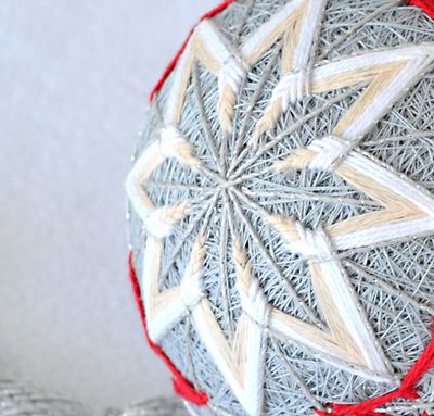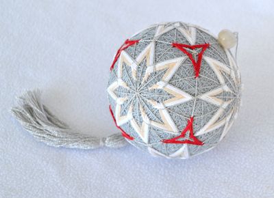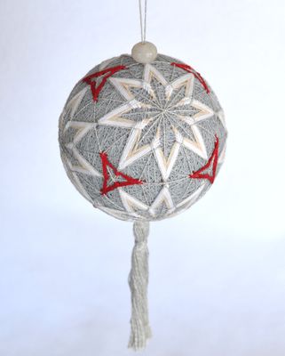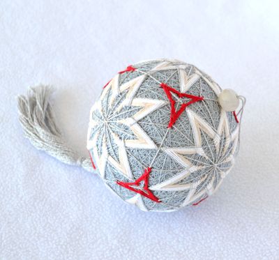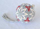 Популярный японский вид рукоделия - вышитый шарик с традиционным узором. Основа (мари) оплетена светло-серыми хлопчатобумажными нитками. На шаре вышиты шесть восьмиконечных звезд и маленькие красные трилистники. Элементы узора оплетены серебристой нитью, что придает шару блеск и дополнительный свет. Шар украшен серебристой кисточкой и бусиной натурального агата дымчато-белого цвета. Диаметр шара около 9 см. Шарик имеет идеально круглую форму благодаря пенополистирольному шару-основе. За счет этого темари очень легкий, его можно подвесить куда угодно.