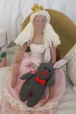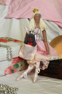 Нежная тильда принцесса в розовых тонах, ассоциируется с весной и пробуждением от зимнего сна. Дружит со своей игрушкой зайкой и повсюду носит его с собой, для этого у нее есть специальная сумочка. Рост куклы 38 см. Рост зайки 10 см. с ушками - 13 см, лапки зайки двигаются. Прилагается аксессуар - сумочка. Одежда не снимается. Материалы - хлопок, трикотаж, фатин, ленты, пряжа, фурнитура, синтепух