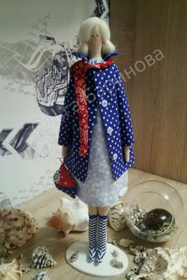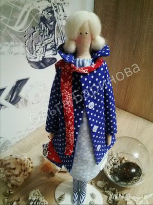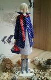 Кукла Тильда, рост 40 см, выполнена из хлопка, в руках кораблик, стоит на подставке, волосы из шерсти для валяния. Прекрасно впишется в Ваш интерьер. Дарите любимым необычные подарки!!!