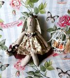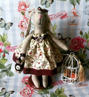 Зайчик Аманда. Рост 25см. Выполнен из натуральных тканей: лен и хлопок. Декорирован атласной лентой, декоративными пуговицами.