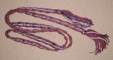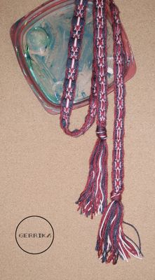 Пояс соткан вручную в одной из самых древних техник - ткачество на дощечках, однако такое изделие будет прекрасно сочетаться с любыми видами одежды и подходит для повседневного ношения. Материал: нитки п/ш трех цветов - кармин, серый и белый. Длина изделия 165 см без учета бахромы, ширина 2 см.