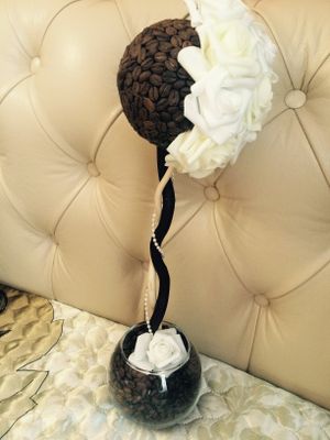 ПРОДАН! При необходимости изготовлю подобный! Пусть в Вашем доме вечно царят мир, гармония, любовь и покой!!! 💞🙏🏻🌹 Топиарий - дерево счастья "Кофе с молоком" 🎉 👏🏻😉 Топиарий или «Дерево счастья» — распространенное украшение интерьера в европейской флористике. Символизирует достаток и благополучие в доме! Эксклюзивный и оригинальный авторский дизайн. Кофейное деревце украшено композицией роз из фоамирана белого и молочного цвета. Высота 45 см. Стеклянное кашпо. Отлично украсит интерьер! Возможна доставка в любую точку страны после 100% оплаты изделия.