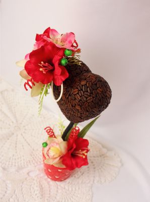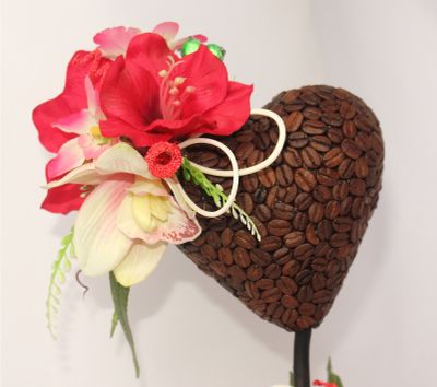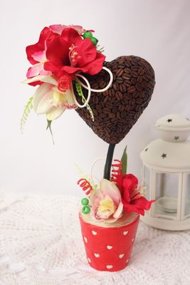 Представляю новиночку : кофейный топиарий "Пламенное сердце" Яркий и элегантный. Необычный авторский дизайн. Кофейное сердце украшено композицией из цветов орхидей и гладиолуса, так же обилие декоративных элементов делают этот топиарий оригинальным и неповторимым. Высота около 30 см. Керамическое кашпо. Отлично украсит интерьер кухни или любой комнаты и станет ярким акцентом и изюминкой. Замечательно подойдет в качестве подарка по любому поводу))) Доставка Почтой России в любую точку страны после 100% оплаты изделия и пересылки. Стоимость пересылки по запросу. Оплату принимаю на карту "Сбербанк" и "ВТБ24"