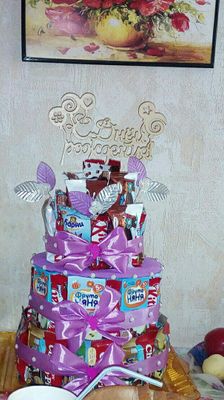 Захотелось сделать что то необычное Для родной кровинки, для любимой доченьки на День рождение ))Разашелся на ура 👍🌹🍰🌼 Из сока, чокопая,барни и разных шоколадок ,пирожных . Как Вам ?))Можно делать из чего вздумается, для разного возраста и любого праздника