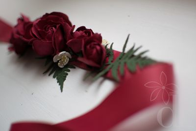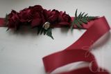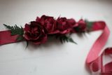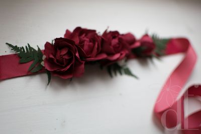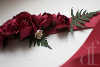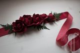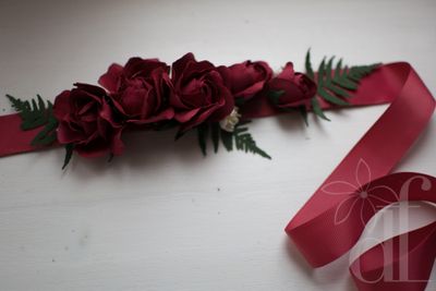 Яркий цветочный пояс для свадебного или вечернего платья. Насыщенные розы цвета бургундского вина, в сочетании с контрастной зеленью папоротника и мелкими цветками вишни? составляют шикарную композицию на поясе из репсовой ленты малинового цвета. Ширина ленты 2,5 см, длина пояса 2,3 м. В месте, где располагаются цветы, пояс проклеен корсажной лентой и подшит дублирующей лентой. Цветы выполнены вручную из фоамирана, Цветы и весь пояс не боятся воды! По вашему желанию возможно создать несколько шпилек-розочек для прически и/или бутоньерку для жениха. Так же могу создать букет-дублер из этих цветов, который останется у вас на долгую память о торжестве (еще с таким букетом можно устраивать фотосессии в годовщину торжества).