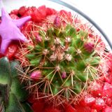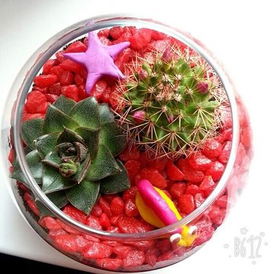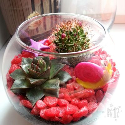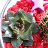 Яркая композиция!Эхеверия и кактус маммиллялия Зейльмана,которой в скором времени порадует вас нежными розовыми цветочками.Из декора фигурки улитки и звезды,а также красные камушки.