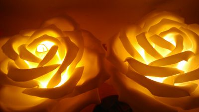 Выглядит очень свежо, необычно, красиво -Роза выполнена из экологически чистого материала. -Выдерживает температуру от -100 град. до +70 град. цельсия -Материал негорючий -Цветок может находится как в помещении так и на улице. -Легкий в уходе. - подключение к розетке 220 V, лампочки 60 Вт