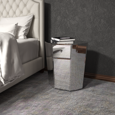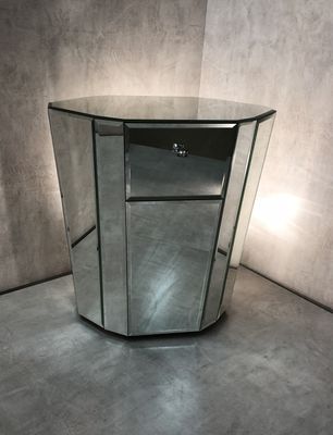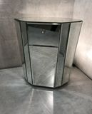 Тумба зеркальная материал корпуса: МДФ 16 мм (окраска в черный цвет) материал облицовки: зеркало 4 мм (серебро), обработка фацет 10 мм фурнитура: шариковые направляющие, опоры регулируемые, ручка размер: 400х580х595мм