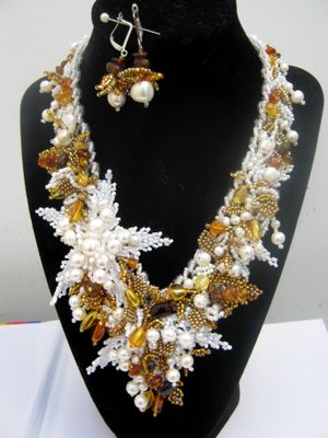 Авторское украшение изготовлено из натурального жемчуга и янтаря