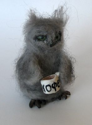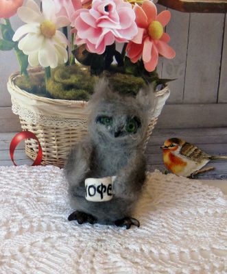 С Добрым утром, Сова! А чтобы оно действительно стало добрым, необходимо выпить горячего, душистого кофе! Чтобы утро сделать добрым, Ты начни его с зарядки: Нужно чуточку побегать, Выпить кофейку украдкой, Душ принять,постель заправить, Пресс качать,штаны погладить, На лицо надеть улыбку, Грудь поднять, втянуть живот И с собою взять в дорогу Преогромный бутерброд! Наша совушка выполнена в смешанной технике. Используемые материалы-полимерная глина и шерсть для валяния. Наша Сова обязательно пожелает вам доброго утра и хорошего настроения, станет добрым талисманом на целый день. Эта милая валяшка станет хорошим подарком для дорогих и близких, пополнит коллекцию любителя миниатюр...