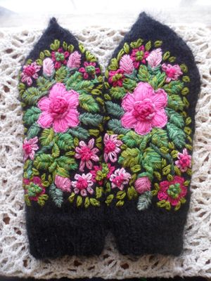 Тёплые, уютные варежки из пряжи с большим содержанием мохера. Яркая, объёмная вышивка гладью тамбурным швом и рококо безусловно привлекают внимание. Размер 6/7. Возможно выполнение аналогичных на заказ, но не точной копии.
