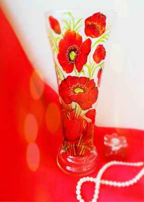 Ваза "Маки" выполнена в стиле витражного рисунка акриловыми контурами и витражным лаком. Эта современная вазочка отлично дополнит и украсит ваш интерьер в любой комнате. Можно использовать вазу даже без цветов, сухоцветов и т.п. так как она сама по себе является интересным элементом декора помещения.