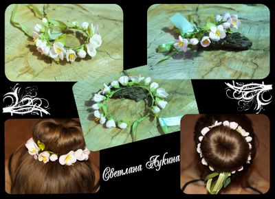 Украшение ручной работы.Каждый цветочек и листочек крепко вплетегы в венок. Крепится на прическе с помощью лент, прикрепленных к краям венка.Очень украшает прическу, создает весеннее настроение!