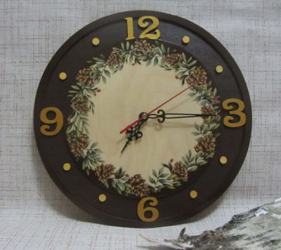 Часы ручной работы "Венок из шишек" выполнены в единственном экземпляре. Они принесут уют и радость в ваш дом, поскольку сделаны с любовью. Материалы, используемые при работе - фанерные заготовки, акриловые краски, акриловый лак, яхтный лак, часовой механизм.