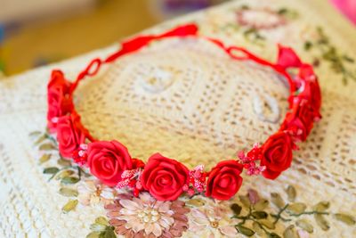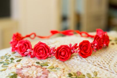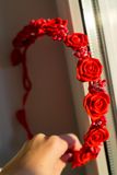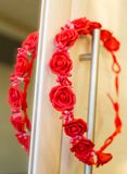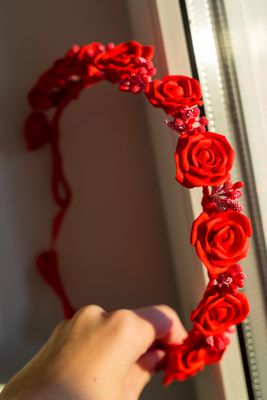 Венок на проволоке, оплетен атласной лентой, цветы - красный фоамиран, тычинки. Свадебный. Размер регулируется.