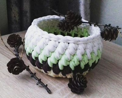 Трехцветная корзинка для хранения мелочей. Прекрасно впишется в любой интерьер. Выполнена из трикотажной пряжи (100% хлопок).