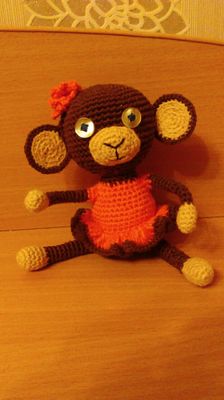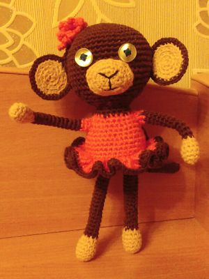 Забавная обезьянка в юбочке, связанная крючком из 100% х/б ниток. На голове цветок. Глазки - пуговки. Наполнитель полиэфир. Идеально подойдет для деток! Высота обезьянки 17 см. Для Вас свяжу в любой комбинации цветов.