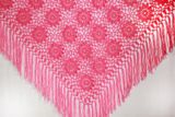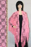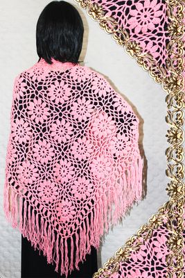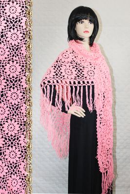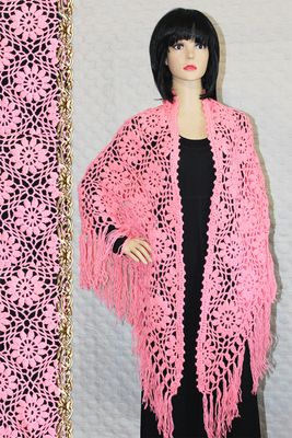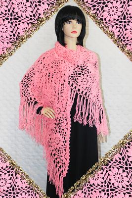 Шаль ажурная вязаная крючком, приятного розового цвета. Шаль теплая, она согреет вас зимой, ее приятно накинуть на плечи и прохладным летним вечером. Цвет очень освежает лицо, радует взор. Шаль это домашний уют и комфорт. Ажурная вязаная шаль зимой вы можете носить ее поверх одежды, что придаст шарм вашему образу.