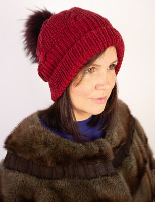Вязаная шапка с помпоном выполнена вручную на спицах. Использована дорогая итальянская пряжа 100% шерсти мериноса. Роскошный большой помпон из натурального меха енота.