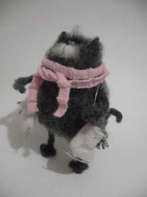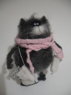 Кот связан из мохеры, внутри синтепон, в лапках и хвостике вставлена проволока, глазки приклеены. Стоит за счет хвостика, но надо выставлять. Размер 17-18 см