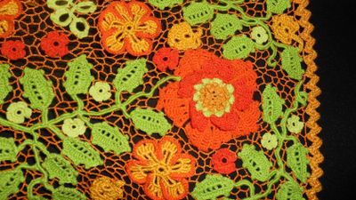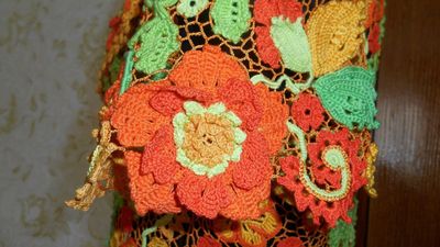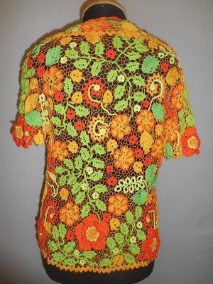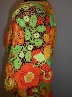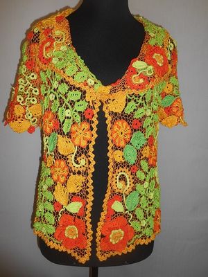 Модель выполнена в сложной технике наборного ирландского кружева из хлопка, хлопка с вискозой и шелка.Размер 46-48.