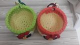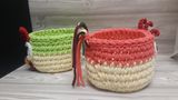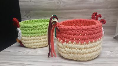Эти корзиночки великолепно впишутся в любой интерьер,а так же идеальны для подарка. Они предназначены для хранения всякой всячины и в доме всегда будет порядок. Связаны из трикотажной пряжи(100%хлопок). Диаметр 13 см,высота 10 см