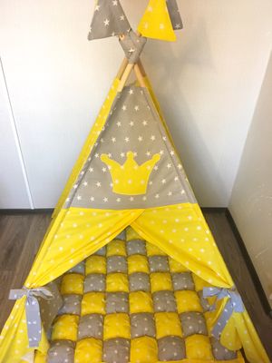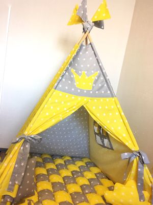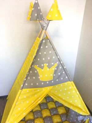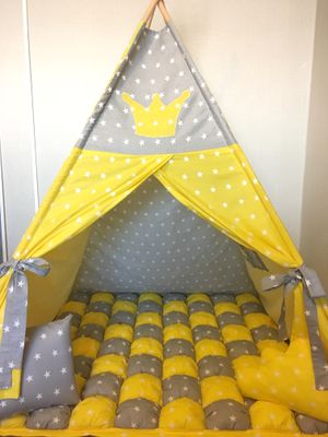 Универсальная расцветка Вигвамчика, отлично подойдёт и мальчишкам и девчонкам! А так же семьям где разнополые детки!👩👧👦 В комплект входит: 💛Вигвам с окошком 🖤Коврик бомбон 💛Декоративные подушки 🖤Флажки