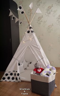 Все дети любят укромные уголки. Только в уединении можно дать волю своей фантазии и отправиться в увлекательное путешествие по воображаемым мирам. Именно поэтому дети часто сооружают самодельные домики из подушек, пледов и других подручных средств. Но если вы хотите, чтобы ваш ребенок почувствовал себя отважным путешественником или героем своей любимой сказки, подарите ему вигвам. Все вигвамы сделаны из 100% хлопка, на деревянных палочках, все это ручная работа, Это идеальный подарок, который порадует ваших малышей. Здесь можно играть в одиночку или целой компанией, а еще палатка - просто незаменимая вещь во время детских праздников и пикников. Вигвам легко собирать и разбирать: его достаточно просто развернуть и набросать внутрь побольше удобных подушек. Идеальное пространство для игр готово! Размер вигвама 110*110, выполнен из 100% хлопка. Дополнительно можно приобрести коврик, подушки, корзину под игрушки.