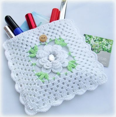 Косметичка связана крючком из 100% мерсеризованного хлопка в форме квадрата. В середине цветок с пришитой пластиковой стразой. Внутри подкладка из белого хлопка. Застегивается на деревянную пуговку. В основе все тот же "бабушкин квадрат". ) Размер 16*16 см