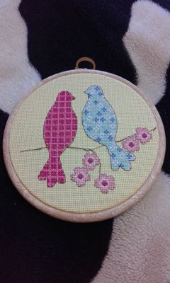 Вышитая картина "Райские птицы" оформлена в деревянную круглую раму-пяльца, украсит любой интерьер. Материалы: Канва Aida 14 желтая, нитки мулине, деревянная рамка-пяльца