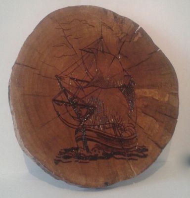 Картина ручной работы!!! Выполнена техникой пирографией (выжигание). Картина на которой изображен блуждающий корабль. Выполнен на тополе которое очень хорошо подчеркивает этот корабль своими готовыми слоями.