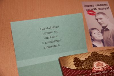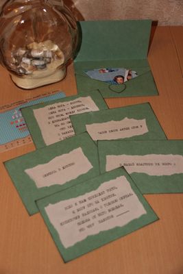 Итак, как я и обещала, публикую задания для домашнего квеста. Кстати его легко видоизменить "под себя", учитывая наличие своих помещений, предметов, бюджета и т.д. Поехали! Муж возвращается с работы. Его встречает жена и дарит по случаю праздника шоколадку (можно конечно не в пороге:-) а после ужина и других дел - выбирайте сами подходящее время))) Но! Шоколадка не простая, а в обёртке собственного производства: с фото, где они вдвоём и надписью "Самому сладкому сладкий подарок". И с обратной стороны внутри обёртки первое задание и первая подсказка: РАЗГАДАЙ ЧИСЛО: ОТДЕЛЬНО ТЫ, ОТДЕЛЬНО Я И ПЕРЕВЁРНУТАЯ БЕСКОНЕЧНОСТЬ Ответ: 118 (их номер квартиры). Разгадав эту не сложную загадку, он идёт к почтовому ящику, где его ожидает конверт со следующей подсказкой: в конверте лежит разрезанная на части картинка, которую нужно собрать, как пазл. На картинке девушка пин-ап в ванной. Соответственно следующий пункт назначения - ванная комната. За время его отсутствия необходимо набрать воду в ванну и погрузить в неё заранее подготовленную бутылку с запиской, а также с белым морским песочком (манкой))) и ракушками. Бутылку конечно плотно закрыть пробкой. В записке, скрученной в трубочку и перевязанной шпагатом, написано следующее: ОТВЕТЬ НА 2 ВОПРОСА, ПОЛУЧИШЬ 2 СЛОВА, ПО КОТОРЫМ НАЙДЁШЬ НУЖНЫЙ ПРЕДМЕТ, А В НЁМ ПОДСКАЗКА! КОГДА ВЕЩЬ НЕ ТВОЯ, ТО ЧЬЯ? ЧТО ПРОИСХОДИЛО С 1941 - 1945? 229/48 47/1 274/1 249/20 Ответ: чужая война (это название книги, в которой он должен отыскать номера страниц и букв и разгадать слово ШКАФ) Там его ждёт очередное задание. В шкафу лежит карточка с заданием по математике для 1 класса))))) Её я распечатала на плотной глянцевой фотобумаге размером 10*15 см. Разгадав слово КУХНЯ, следуем туда:) И находим там следующую карточку с загадкой: (для усложнения напечатано задом наперёд) Ответ: ботинок Далее следуем к обуви... и находим там карточку с текстом: В НАШЕЙ КВАРТИРЕ ИХ ВСЕГО 2 Ответ: батарея Кстати, если человек "тупит" и "зависает", можно предложить подсказки за поцелуи/обнимашки))) На батарее "греется" новая загадка: ЕСЛИ К НАМ ПРИХОДЯТ ГОСТИ, Я БЕРУ ЕГО ЗА ХВОСТИК. КИПЯТОЧКУ НАЛИВАЮ, С ГОЛОВОЮ ОКУНАЮ. ПОЛЬЗА ОТ НЕГО БОЛЬШАЯ. ЭТО ЧТО? ПАКЕТИК ______ Ответ: чааая))))) Ищет коробку с чаем и находит там ещё одну детскую загадку: ОДНА НОГА - КОРОЧЕ, ОДНА НОГА - ДЛИННЕЕ, ПРИ ЭТОМ, МЕЖДУ ПРОЧИМ, В ДВЕНАДЦАТЬ РАЗ БЫСТРЕЕ! НО, НЕ СМОТРЯ НА ЭТО, ОНИ ИДУТ КУДА-ТО С ЗАКАТА ДО РАССВЕТА, С РАССВЕТА ДО ЗАКАТА... Ответ: часы За ними карточка с призывом: ОКУНИСЬ В ДЕТСТВО! Что означает отыскать детские игрушки))) Та-дааам! В них и спрятан основной подарок! - сладкое сердце из любимых конфет! (ведь он - сладкоежка:)) Ура!!! Квест из 8 заданий пройден, получена масса позитива и найден вкусный презент! P.S. карточки размером 10*15 см из плотной акварельной бумаги, на которую приклеены вырванные клочки с заданиями))) (да да это такая распространённая техгика скрапбукинга)))) Задания для домашнего квеста, квест, подарок любимому, 14 февраля, квест дома, домашний квест Конверт ручной работы также формата 10*15 см, в котором лежит пазл. На последок хочу добавить, что проще всего придумать свои задания, отталкиваясь от того, что имеем в наличии и хотим задействовать в квесте: например, хотим спрятать подсказку в морозилку - думаем как привести к ней человека))) Ищем в интернете загадку, или составляем простой ребус/кроссворд/ш
