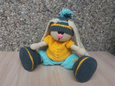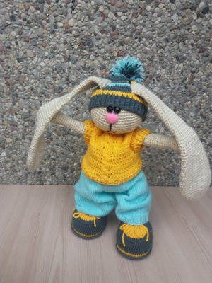 Связан из пряжи акрил,одежда из пряжи хлопок с акрилом. Рост зайки 40 см,стоит самостоятельно,руки и ноги двигаются,одежда вся съемная. Свяжу на заказ как мальчика,так и девочку в любом цветовом решении