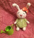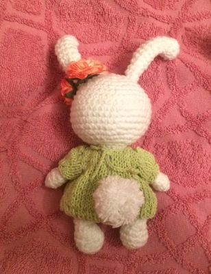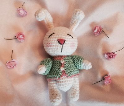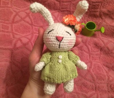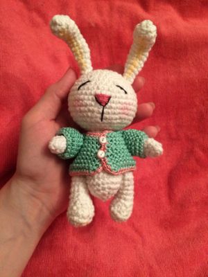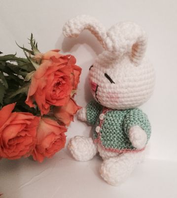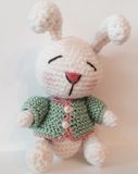 Игрушка зайка сплюшка, выполнени из хлопковой пряжи, приятин на осчуп, одежда снимается, ручки и ножки грутятся, подойдет для детей от годика, рекомендуется ручная стирка, рост 15см