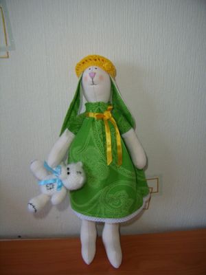 Интерьерная текстильная игрушка ручной работы. Зайка одета в нарядное платье и панталончики. На голове у зайки желтая вязаная шапочка. Игрушка самостоятельно стоит, сидит, лапки и ножки подвижны. Зайка украсит интерьер Вашего дома или станет оригинальным подарком для друзей и близких.