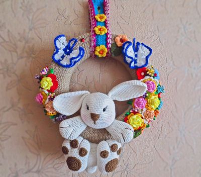Диаметр веночка- 30 см. Зайчишка связан из хлопковой пряжи.