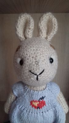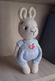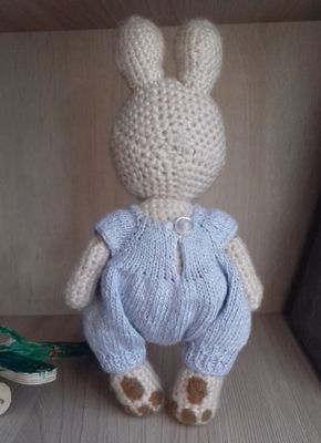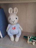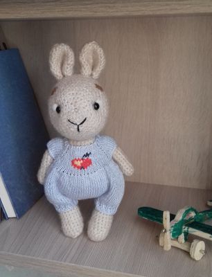 Милый, добрый, очаровательный зайчик, станет любимой игрушкой для ребенка или подарком, который удивит и обрадует! Комбинезон снимается. Ручки, ножки, голова пришиты. Размер зайчонка вместе с ушками 22 сантиметра. Состав: меринос.шерсть, шерсть, акрил, лен, наполнитель: холлофайбер (гипоаллергенный), пластиковые полубусины.