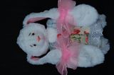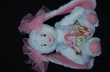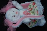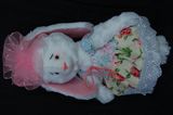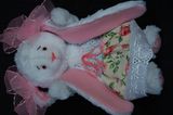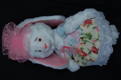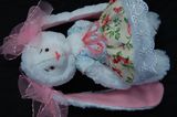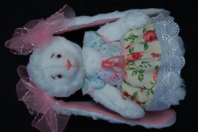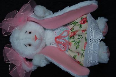 Зайка сшита вручную, в технике тедди, по моей выкройке из искусственного белого меха,на ушках и стопах розовый флис,голова,ручки и ножки на нитяном креплении,глазки-бусинки,наполнитель синтепон,сарафанчик сшит из шитья и бязи,Стоит с опорой,сидит самостоятельно.Рост 26 см.
